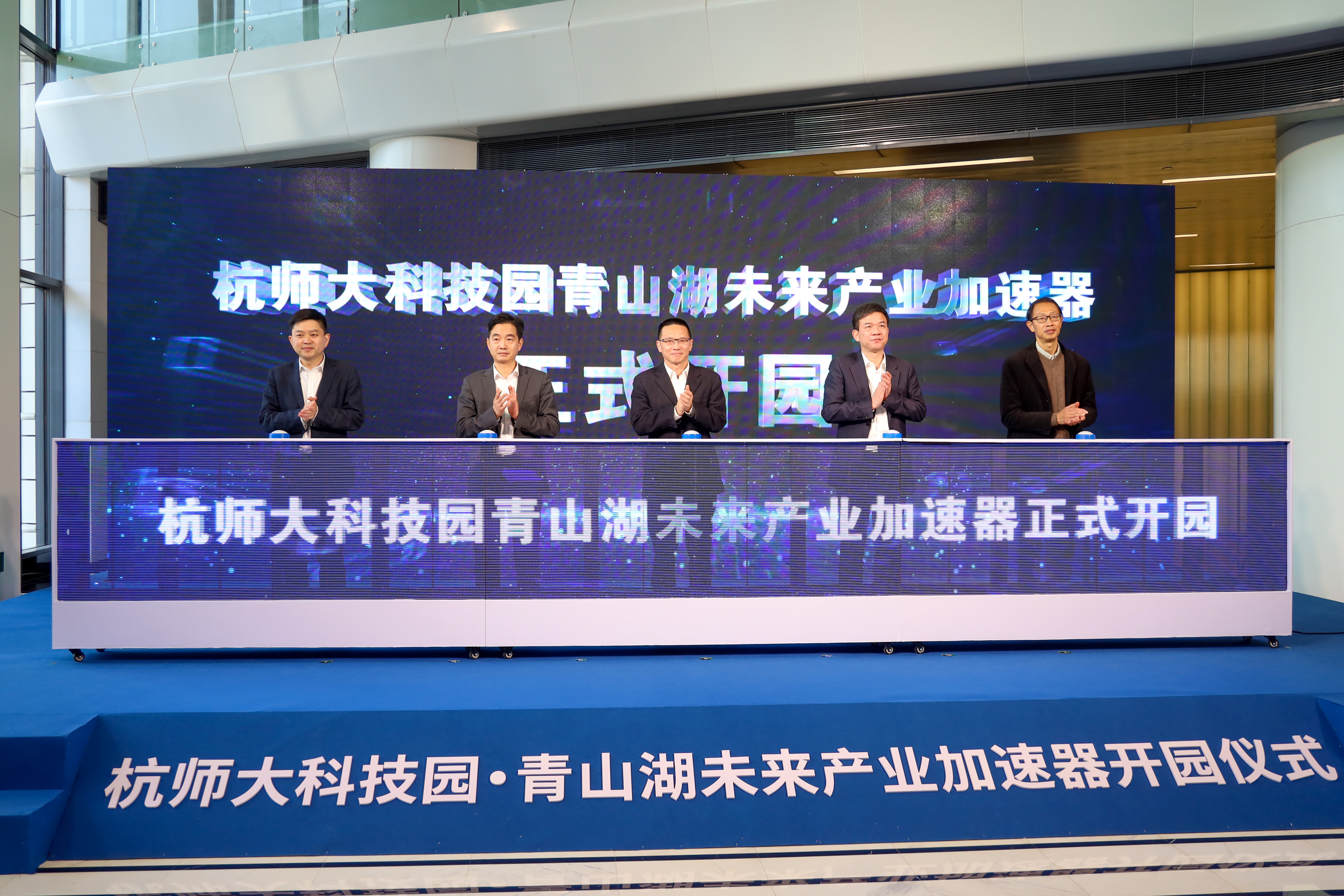 积蓄智造新力量,打造科技芯引擎。4月7日,杭州师范大学国家大学科技园·青山湖未来产业加速器正式开园,将聚焦数字经济、生命健康、双碳科技三大产业,致力打造成为集“创新资源集成、科技成果转化、科技企业孵化、创业人才培育、开发协同发展”为一体的科技创新综合服务平台。我校党委书记郭东风,临安区区委书记杨国正,杭州城西科创大走廊党工委委员、管委会副主任施黄凯,我校副校长胡华,临安区委常委、青山湖科技城党工委书记、管委会主任王学超共同见证了未来产业加速器的启用。
