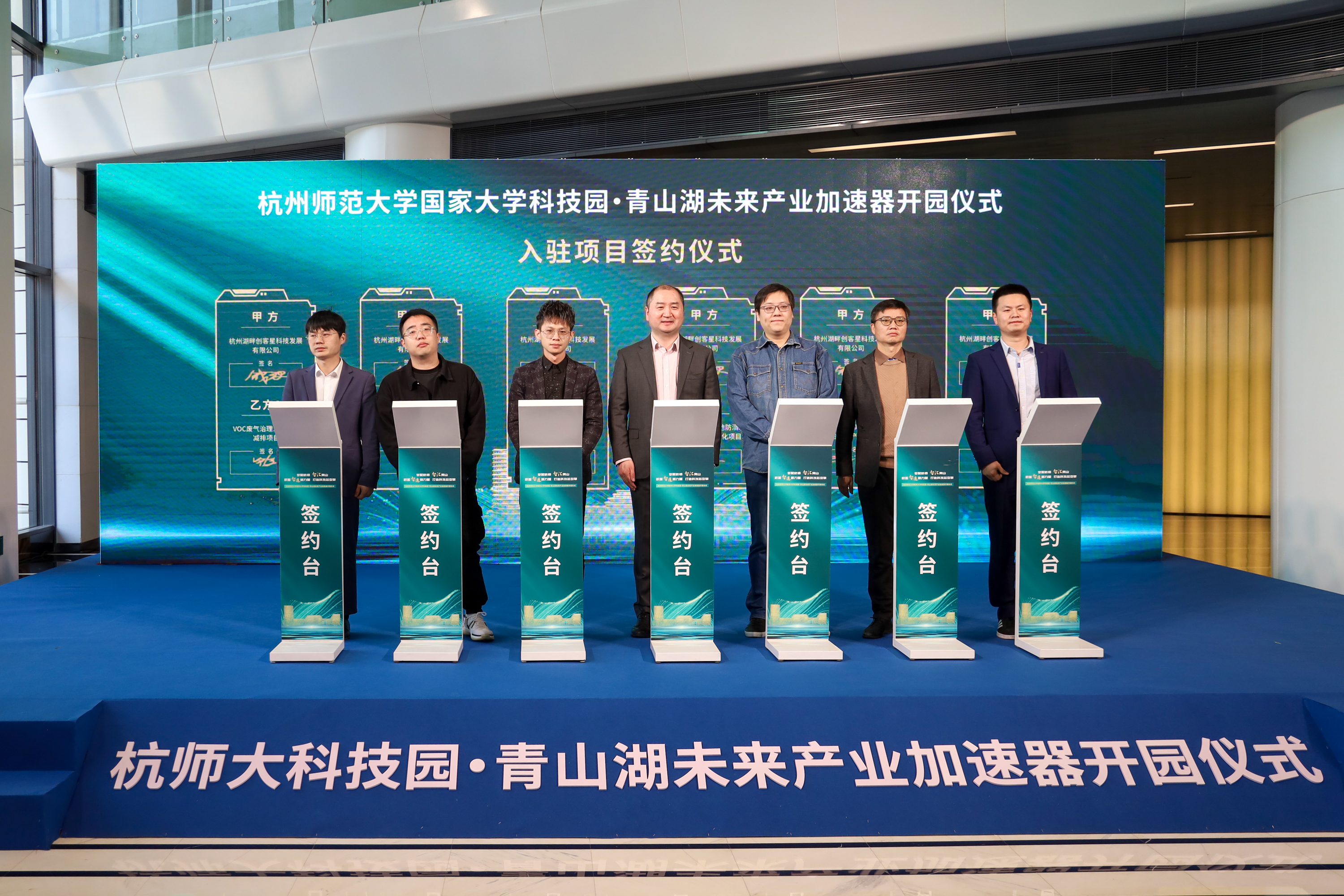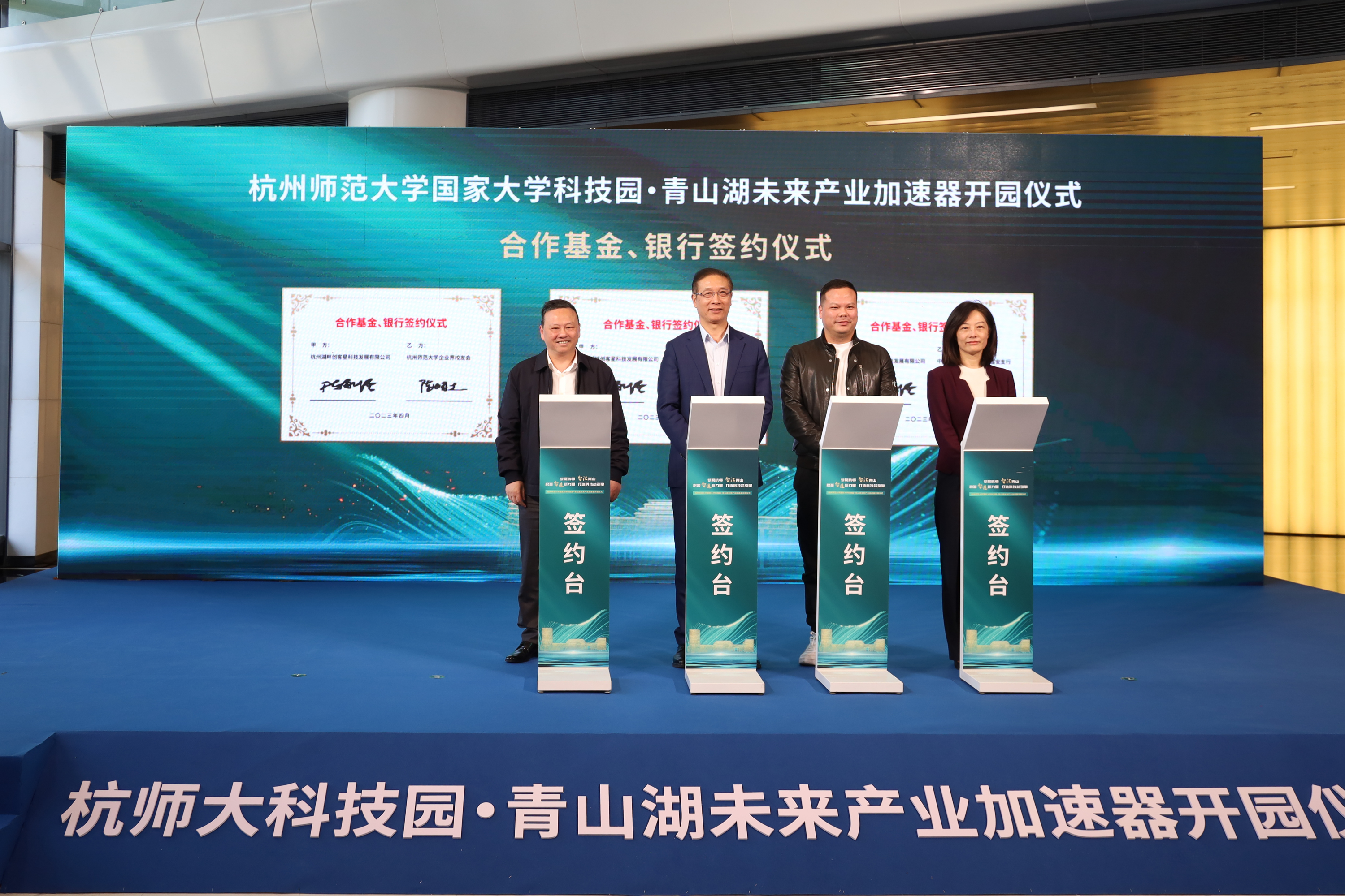 合作基金、银行签约仪式 开园仪式上,杭州师范大学科技园发展有限公司总经理钱波代表加速器与VOC废气治理二氧化碳减排项目团队、基于大健康行业的全案产品研发布局项目团队、增有益-基于健康大数据的特殊膳食项目团队、智慧眼人工智能泳池防溺水安全管理系统产业化项目团队、促进伤口愈合抑制疤痕生成的蛋白因子产业化项目团队、全要素数字孪生低代码平台项目团队等6个入驻项目团队签约,杭州师范大学科技园发展有限公司董事长陈永强代表加速器与杭师大校友科技创新孵化基金、暾澜资本、中国银行股份有限公司临安支行等3家单位签约。 杭州城西科创大走廊管委会、临安区、科技城相关部门负责人,科技企业负责人、金融机构代表,学校办公室、科研处、公管与建设处、联络办(校友办)、工学院相关单位负责人等参加开园仪式。