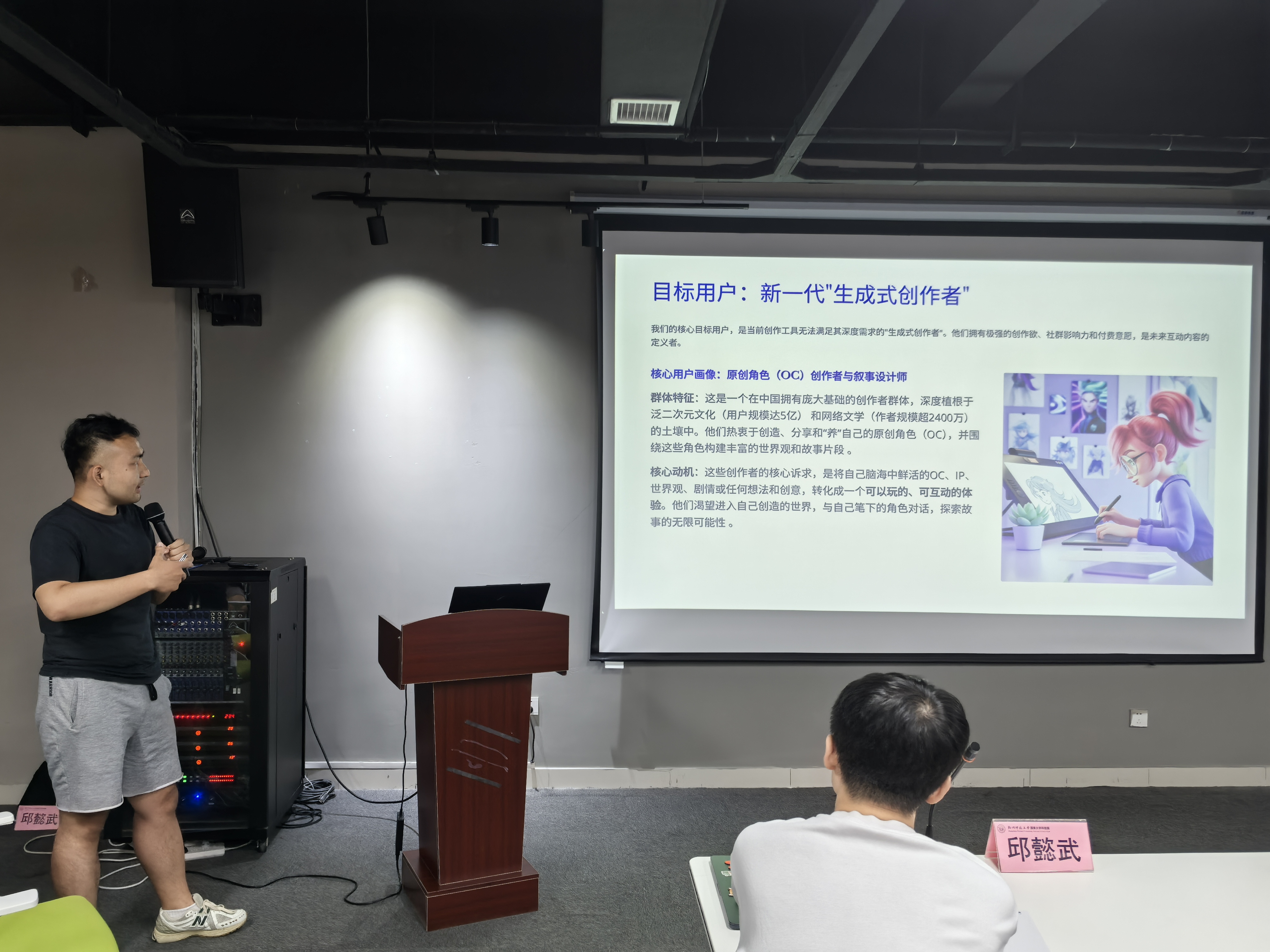 本次活动围绕大学生创业全流程需求,通过打造“主题分享+模拟路演+青年资源对接会”三大核心环节,形成“理论赋能—实战练兵—资源落地”的闭环服务,为创业学员提供全方位支持。活动伊始,造物云CEO邱懿武为学员带来《AI时代创业思维升级:大学生如何甄别真风口、挖掘可持续盈利点》主题分享。他结合自身创业经历,深入解读AI创业的CCC模型(Core核心变化、Chain价值链重构、Creative Leverage创造性杠杆),剖析AI“类人”特性及多行业应用场景,并从机会识别、路径选择、四阶段商业化验证(基因Gene、创意Idea/TPF、创新MUI→PMF、创业GTM/Scale)等维度,为学员梳理出“借CCC模型找机会—结合AI特性匹配优势—分阶段验证商业化”的清晰路径。分享中,邱懿武还针对创业痛点答疑,鼓励学员平衡创新与风险,现场学员踊跃提问,收获颇丰。