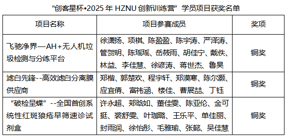 一直以来,科技园积极融入学校创新创业人才培养体系,通过开设创新创业课程、培训大学生创新创业能力、组织大学生实习实践、培养产业紧缺人才等方式,为学校创新创业人才培养工作发挥积极作用。 在本次大赛中,除上述两个银奖项目外,“创客星杯•2025年HZNU创新训练营”学员项目也有3个获得铜奖。具体获奖名单如下: