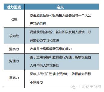潜力因素是比经验、智商等更能预测一个人的未来发展空间。基于过去经验和现在能力的面试理论假设前提是过去的经验和现在的能力是预测未来成功的关键影响因素,就如要评估一个运动员在即将到来的比赛中的成绩,是通过它过去的训练表现、以往比赛成绩等来预测。但现在我们面临的环境是多变的、复杂的、难以预测的,因此除了考察以往的因素,评估其未来的潜力更具有价值。而且对于创业企业来说,除非创始人具备耀眼的职业经历、资本或社会影响力,否则很难能找到经验和能力俱佳的合伙人,创始人从潜力角度去评估,更易发现具备合伙人潜质的人才。